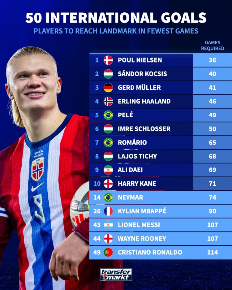 10月13日讯,上周在世预赛中,哈兰德展现了出色的发挥,成功上演帽子戏法,这一成就使他成为历史上第4快完成国家队50球的球员。作为对比,梅西在达到这个里程碑时出战了107场,而C罗则需用114场。德国转会市场的数据列出了达成国家队50球所需的场次最少的球员。
